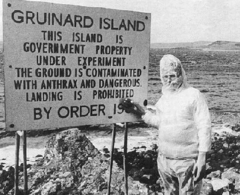 Pada tahun 1942, pemerintah Inggris membeli Pulau Gruinard untuk menguji senjata biologis, khususnya anthrax. Selama percobaan, ditemukan bahwa anthrax telah mencemari lingkungan untuk jangka waktu yang panjang dan menyebabkan kematian penduduk di 95 persen kasus.