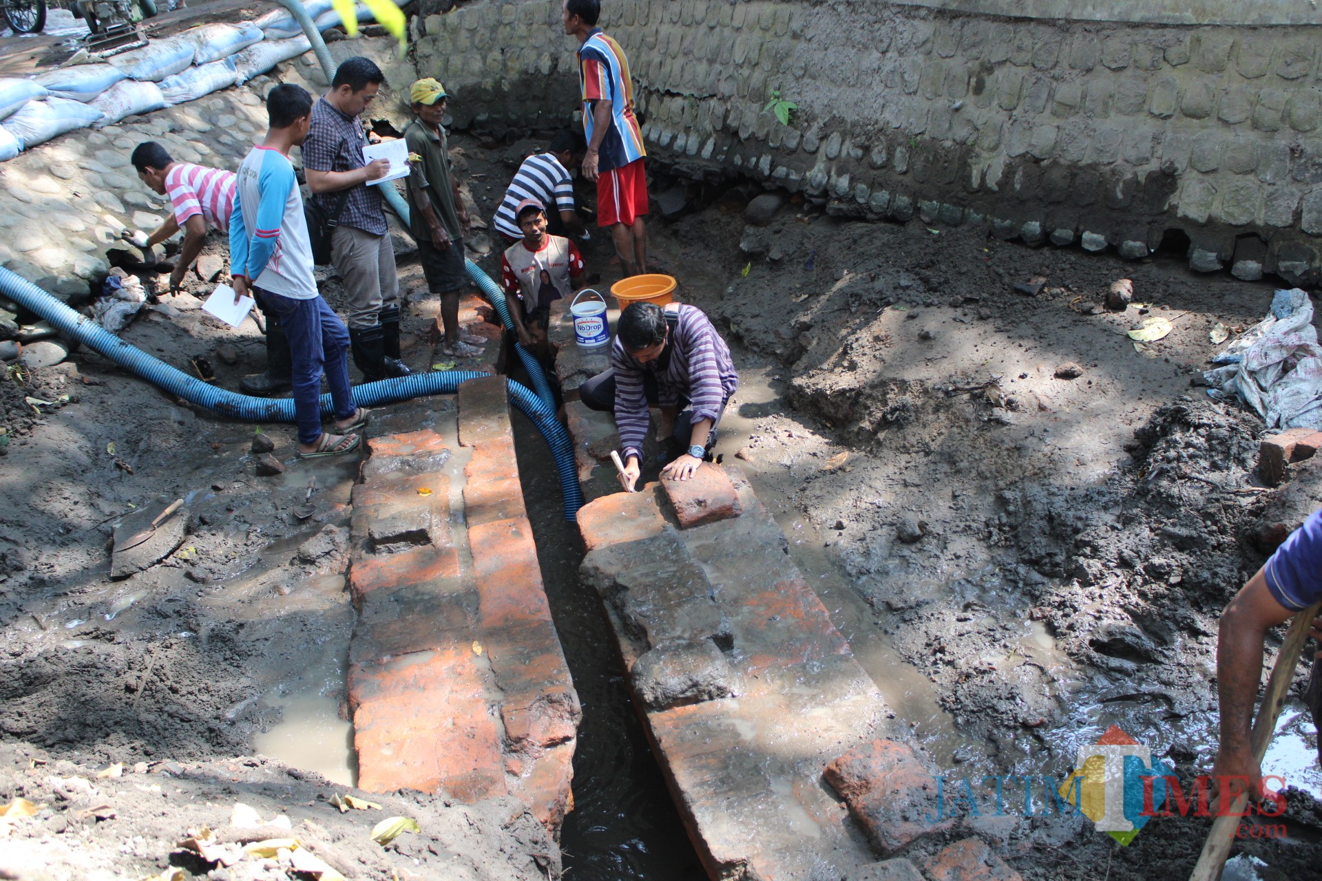 Bangunan purbakala berbentuk kanal kuno atau saluran air yang ditemukan di dasar sendang Dusun Sumberbeji, Desa Kesamben, Kecamatan Ngoro, Kabupaten Jombang, mulai nampak memanjang.