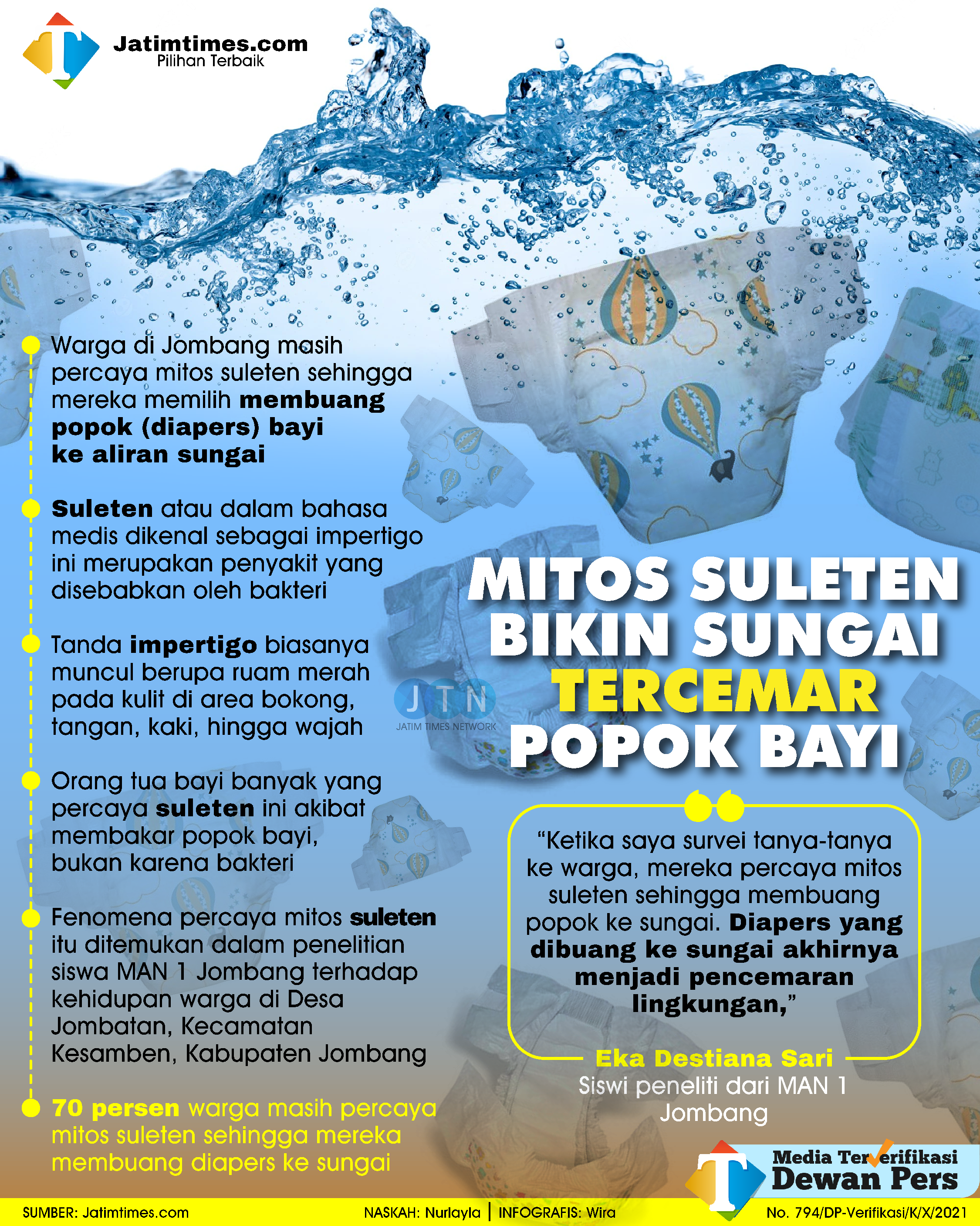 Dikatakan Eka, akibat mitos suleten itu dampaknya sungai di Desa Jombatan kini tercemar limbah popok bayi.